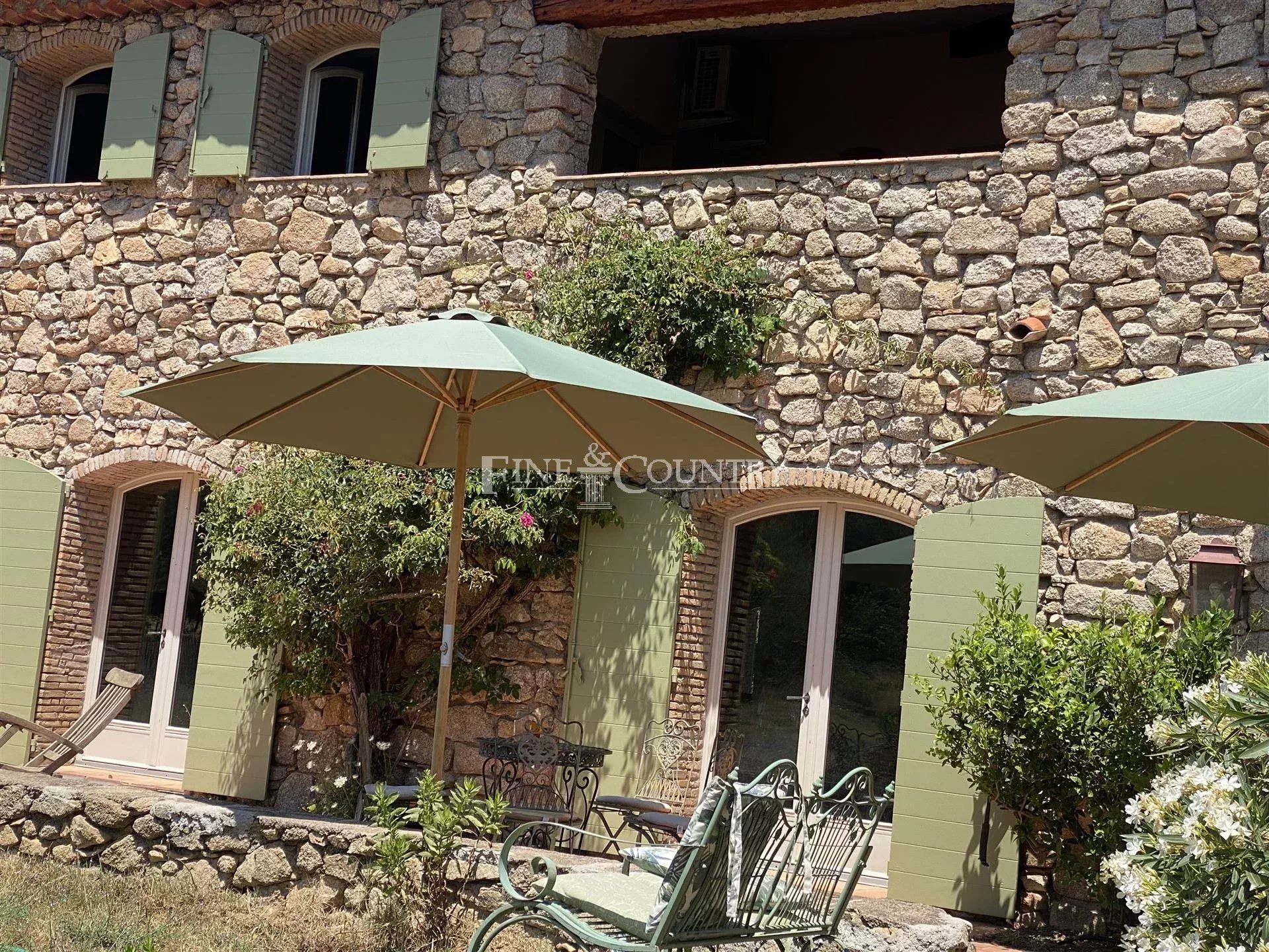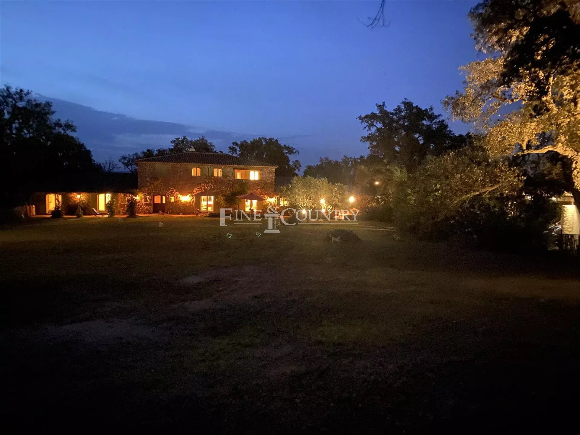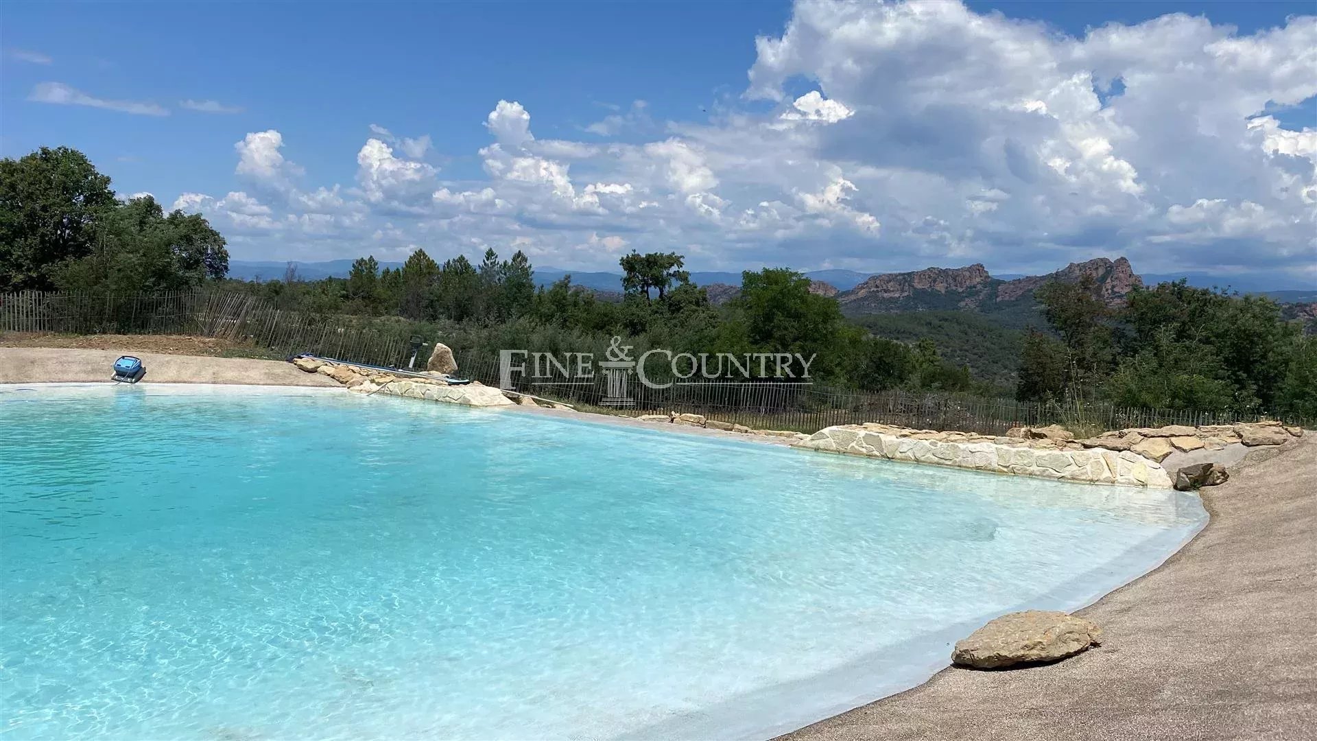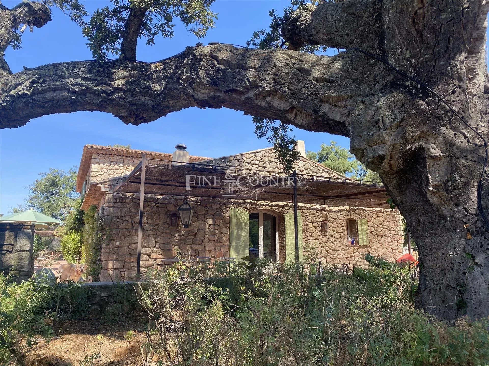 ref: 102025-355 - Superbe propriété en pierre et maison de gardien située dans un parc naturel, entourées de chênes centenaires, avec vue imprenable sur les rochers de Roquebrune-sur-Argens Cette magnifique maison en pierre, construite à partir de matériaux locaux, offre un cadre de vie exceptionnel au cœur de la nature préservée du massif des Maures. Située à seulement 18 km de la mer et à environ 55 minutes de l’aéroport international de Nice, elle bénéficie d’un emplacement idéal, alliant tranquillité absolue et accessibilité. Entièrement rénovée en 2023, la propriété est en excellent état et séduit par son charme authentique et ses prestations haut de gamme. Elle offre une surface habitable d’environ 480 m² sur un terrain d’environ 8 hectares, dont 3 hectares entièrement clôturés. Les dimensions sont exceptionnelles, un séjour majesteux avec sols en pierre offre plus de 100m2, la cuisine de 44 m2 et ses 9 chambres toutes avec salles de bains ou douche et toilettes, ont des surfaces de 20 à 25 m2. La villa est entourée de terraces et de grands arbres centenaires et toute proche, la piscine de forme naturelle alimentée par le forage, offre une vue magnique et une intimitée exceptionnelle. À une centaine de mètres de la maison principale se trouve une maison d’amis en pierre de 47 m², comprenant une cuisine, une chambre, une salle de bains et des toilettes indépendantes. Le parc, superbement entretenu, abrite plus de 100 chênes-lièges majestueux, tous magnifiquement éclairés la nuit. La piscine, d’une conception unique évoquant la mer toute proche, invite à la détente et au bien-être. Cette propriété rare est idéale en tant que maison de famille, résidence secondaire ou chambres d’hôtes de charme. Chauffage central au fioul. Piscine, terrasse, balcon. 10 places de stationnement. Cave, cheminée, rangements intégrés. Buanderie. Garage. Abri voiture. Climatisation, digicode. Exposition plein sud, sans vis-à-vis. Forage qui offre une autonomie totale pour l'eau. DPE D et C pour la maison de gardien.